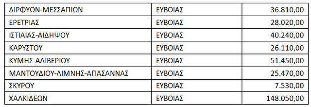 Στους Δήμους της Εύβοιας θα διατεθούν 363.680 ευρώ, τα οποία κατανέμονται ανά Δήμο σύμφωνα με τον παρακάτω πίνακα: