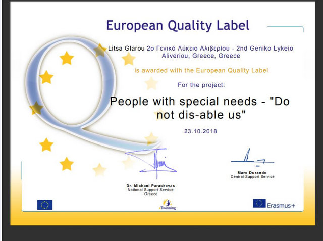 Για τέταρτη συνεχόμενη χρονιά βραβεύτηκε το 2ο Γενικό Λύκειο Αλιβερίου με Ευρωπαϊκή Ετικέτα Ποιότητας για το έργο eTwinning (Ευρωπαϊκό πρόγραμμα αδελφοποίησης σχολείων) με τίτλο “People with special needs - Do not dis-able us” (Άτομα με ειδικές ανάγκες: “Μη μας παραγκωνίζετε”), που υλοποίησε κατά τη διάρκεια του σχολικού έτους 2017-18.